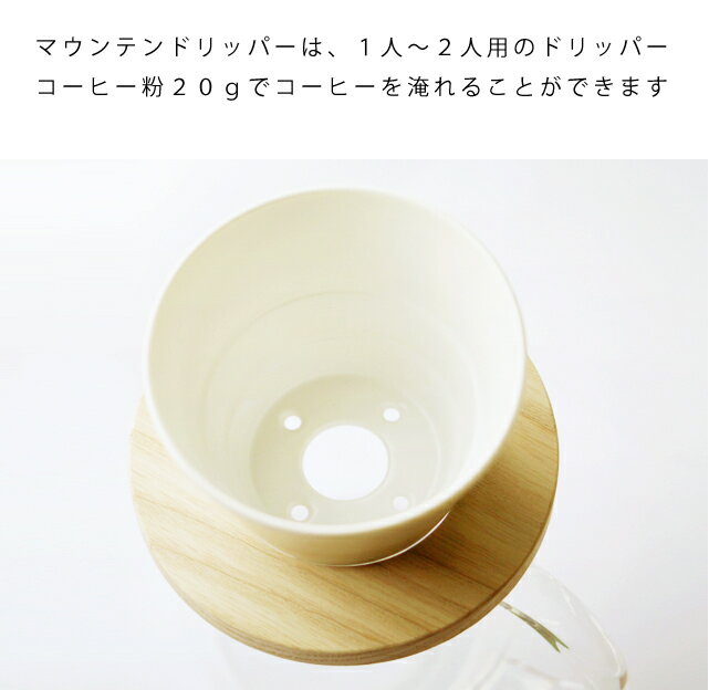 ラッピングご希望のお客様はこちら ドリッパーはこちら ペーパーフィルターはこちら コーヒーミルはこちら コーヒーポットはこちら シングルオリジンコーヒーはこちら ブレンドコーヒーはこちら 商品詳細 「マウンテンドリッパー(Mountain coffee dripper)」は、逆楕円錐台形の磁器部をドーナツ型の受け部の内穴に通し、コーヒーサーバーやカップに直接のせ使用するコーヒー抽出器具です。 しっかり濃いのに、重くない、スッキリした飲み心地のコーヒーを目指し考案した、ドーナツドリッパーの1〜2人用になります。 1〜2人用を作るなら、なにかプラスしたいと考えていて、形と穴を見通すことで、円錐形 (コーノ・ハリオ)ペーパーの形をキープしたまま、使えるようにしました。 (円錐形ペーパーの場合は、ミシンメに沿って折るだけで、お使いいただけます。) 名前は、カップボードにおかれた印象が「山」のようなので「マウンテンドリッパー(Mountain coffee dripper)」に命名されました。 受け部は、ホワイトアッシュを使用しています。 汚れやシミをアジとして楽しんでいただきたいので、むくの素材感を生かした無塗装仕上げにしています。 また、材質と加工から、質実剛健な、しっかりしたコーヒーが入ることを間接的に表現しています。 ドーナツドリッパーと兼用いただけます。 2016年4月より、内穴にテーパーを両側からつけ、穴の径を1mm大きくさせていただきました。 磁器を面で支えるようになりましたので、従来のドーナツドリッパーよりも、一層安定しやすくなりました。 (今まで通り、両側からお使いいただけます。) SPEC 本体素材:白磁 木枠素材:ホワイトアッシュ specialty coffee横浜元町珈琲は堀口珈琲店堀口俊英氏が主宰するLCF(リーディングコーヒーファミリー)に加入しています。 各産地のコーヒー豆(ブラジルコーヒー・コロンビアコーヒー・グアテマラコーヒー・エチオピアモカコーヒー・インドネシアマンデリンコーヒー・ケニアコーヒー・パナマコーヒー・東ティモールコーヒー・ボリビアコーヒー・ルワンダコーヒー・ペルーコーヒー・ハワイコナコーヒー等)や手軽で美味しいドリップコーヒーや、コーノ式・ハリオ・カリタ・デバイスタイル・野田琺瑯月兎印・ボダム等の珈琲関連器具(水出しコーヒー・ペーパードリップコーヒー・ネルドリップコーヒー・エスプレッソコーヒー・コーヒーメーカー・コーヒーミル等)各種取り揃えています。 私どもはコーヒー豆販売・コーヒー豆通販の珈琲豆専門店です。 自家焙煎コーヒー豆・コーヒー生豆等おいしいコーヒー豆をお届け致します。 お歳暮・お中元・母の日・父の日等のコーヒーギフトにも最適です。
